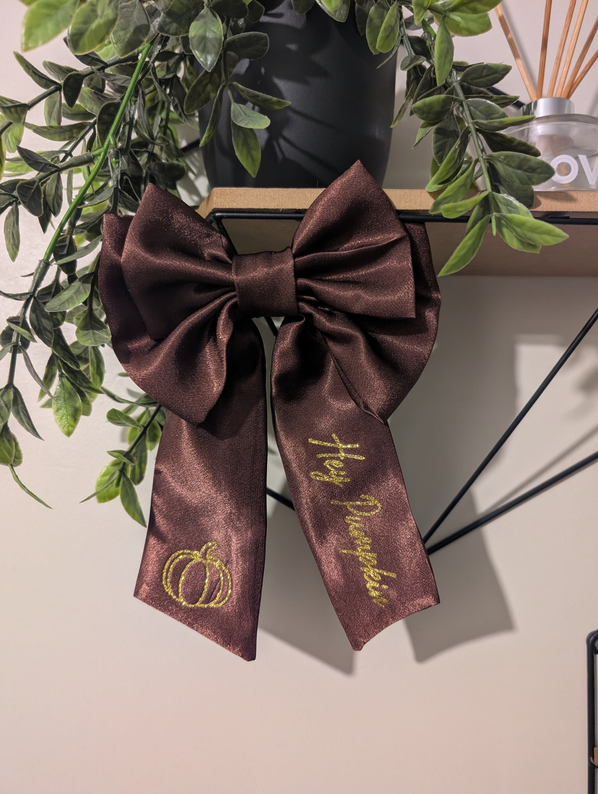 The Bow is approx 16cm accross and the tails are approx 18cm long. This is finished with a barrette clip to the back which is approx 8cm in size.