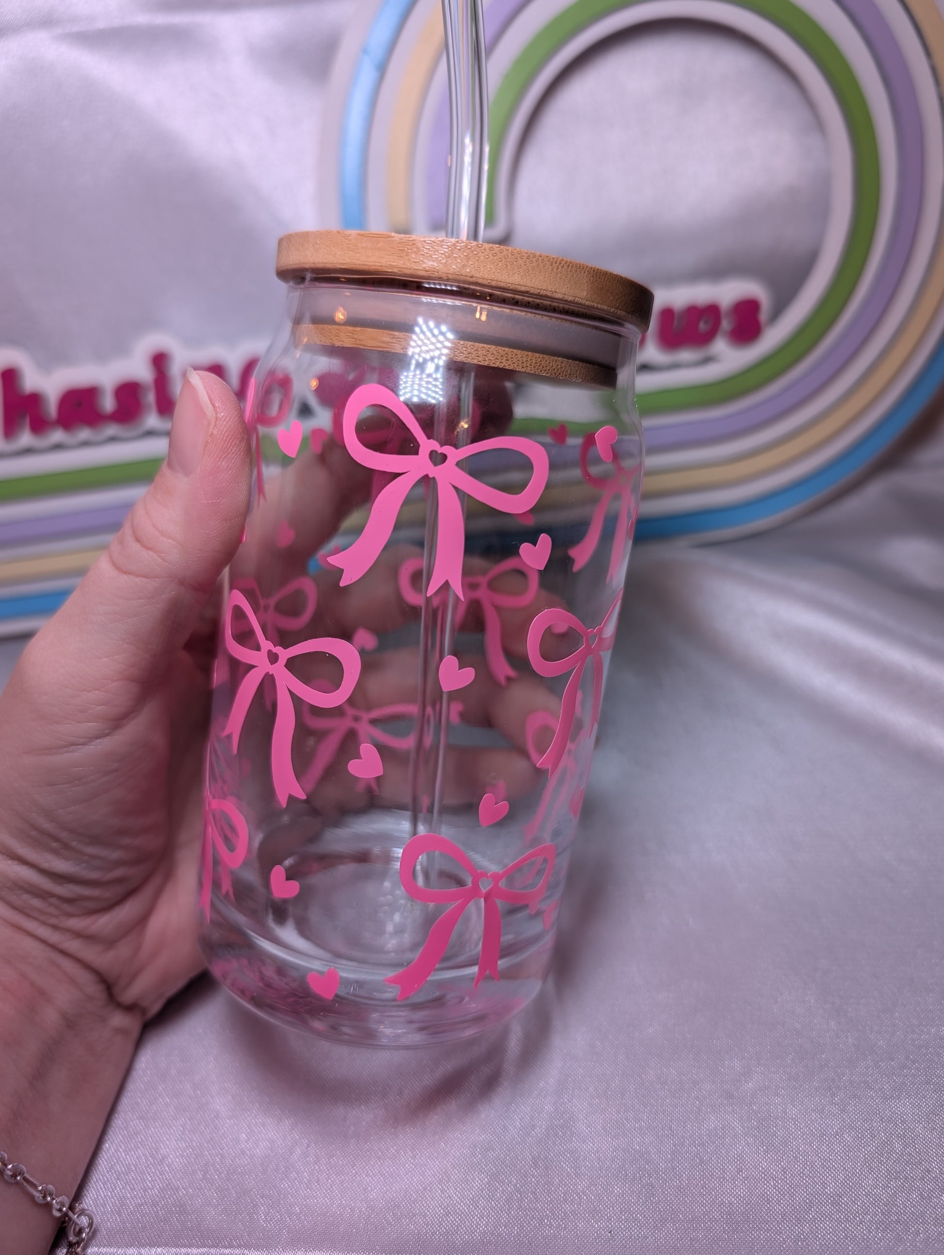 Pink Bows Glass Can with Straw